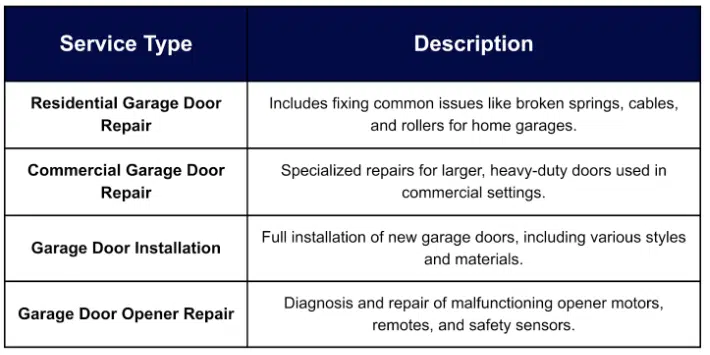 Look for a company that can handle different garage door jobs. A reliable provider will fix current problems and help maintain performance in the future. They should also work with openers and wood garage doors. Below is a table showing common services you should consider when choosing a company.